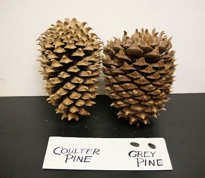 P. sabiniana (left) is wider and rounder. P. coulteri (right) is narrower. Both can be enormous! Notice also that the Coulter Pine's cone scale tips are lighter in color than the interior portion of the cone scale, compared to the Grey Pine's darker cone scale tips.